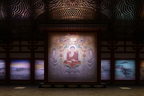 堂内には田渕俊夫画伯により描かれた食堂ご本尊「阿弥陀三尊浄土図」を中心に、全長約50メートルにわたる壁画「仏教伝来の道と薬師寺」が奉納されます。