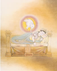 第一入胎 ![]() お釈迦さまのお母さま摩耶夫人が、白象が右脇から入るという不思議な夢をご覧になり、お釈迦さまを身ごもられました。 |