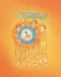 第二 受生 ![]() 摩耶夫人がルンビニー園で、無憂樹(アショーカ)の花に右手を触られた時に、夫人の右脇よりお釈迦さまがお生まれになられました。 |