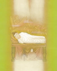 第七 涅槃 ![]() クシナガラ城外の沙羅双樹における最後の説法の後、80歳でその尊いご生涯を終えて涅槃に入られました。 |