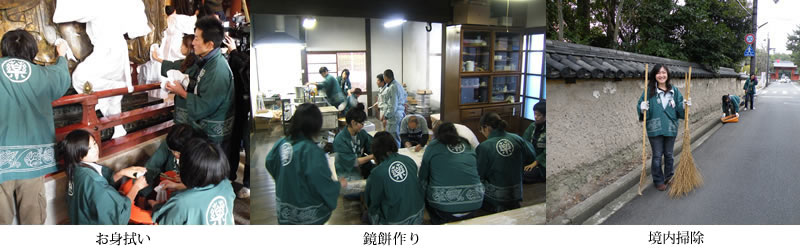 また門松作りなど、失われつつある日本の文化を体感していただけます。また正月三ヶ日は、初詣に来られる参拝者に快くお詣りしていただけるよう、おもてなしをお手伝いいただきます。