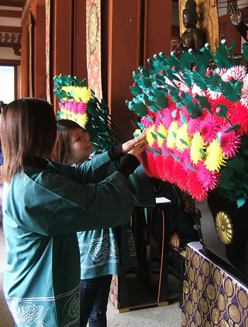 3月21日から始まる花会式の準備では、23日に薬師三尊さまをはじめとする薬師寺の仏さまのお体を清めるお身拭い、仏さまにお供えする 壇 供 (お餅)作りが行われます。24日には堂内を飾る十種の造花を活けて花会式の準備が調います。25日から始まる花会式では、僧侶・参拝者のお世話役である「堂童子」として法要の準備を手がけ、僧侶とともに花会式独特の