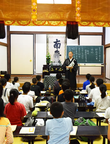 夏休みの寺子屋では「友情・鍛練・自律」を目標に、小中学生の子供たちとお寺の生活を過ごしながら、身近なものへの感謝の心を養います。
